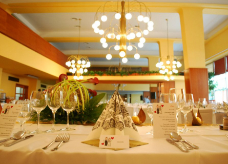 Náš hotel má k dispozícii dve sály, reštauráciu s kapacitou do 160 miest a kongresovú halu s kapacitou do 120 miest, obidve sály majú tanečný parket. Priestory sú klimatizované, čo iste oceníte hlavne v letných mesiacoch.